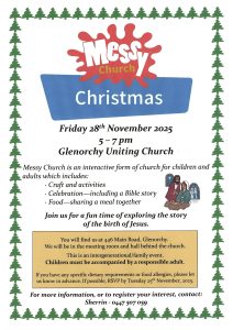 Join us on Friday 28th November, 5-7pm at Glenorchy Uniting Church for our Christmas Messy Church, as we explore the story of the birth of Jesus.